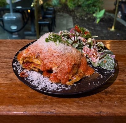 Our signature beef brisket lasagna, layered with rich Napoli sauce, melted mozzarella and a hint of Parmesan. Served alongside golden chips and a crisp garden salad.