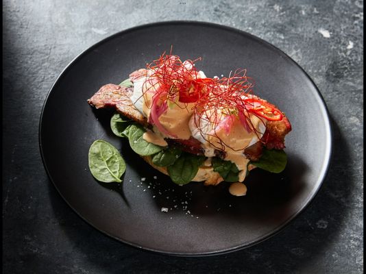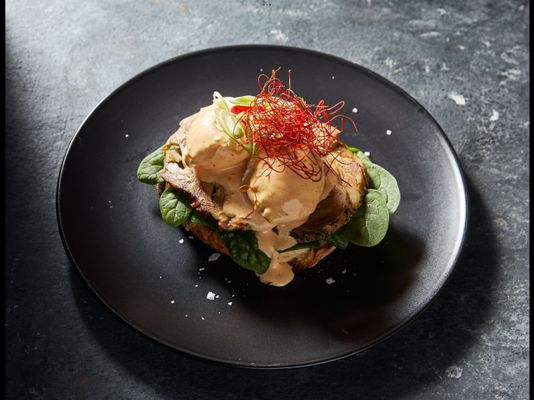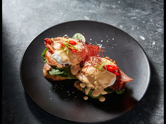 House smoked brisket layered with a homemade hollandaise sauce and perfectly poached egg. All a top a bed of spinach & buttered sourdough. Finished with our signature house garnish.