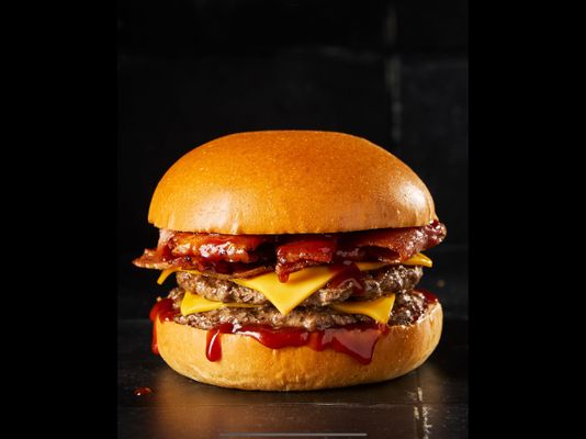 Two grass fed beef patties, smoked bacon, Cheddar cheese served on a freshly baked milk bun.