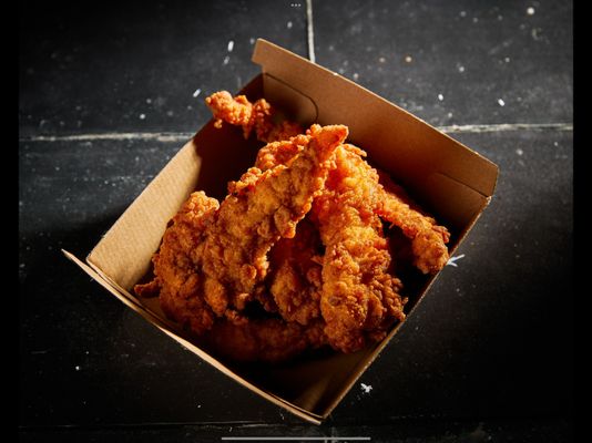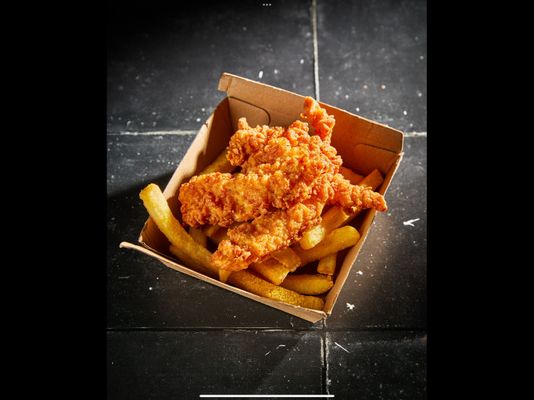 3 chicken strips served with a side of fries. Fries seasoned with chicken salt.