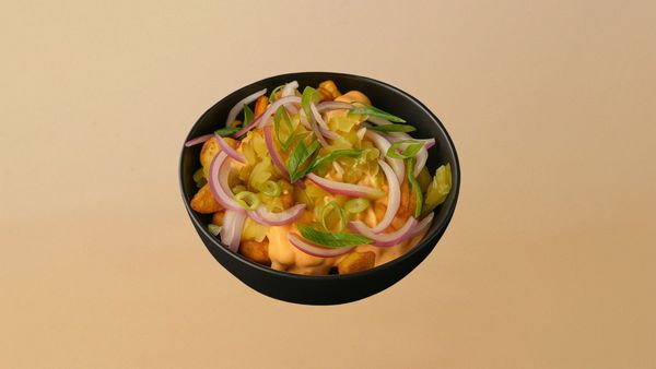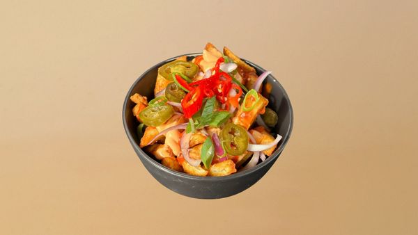 Topped with jalapenos, red onions, spring onions, hot chilli sauce and gooey Cheddar cheese sauce.