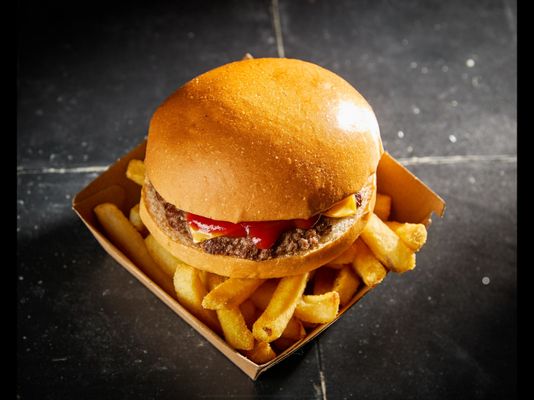 Grass fed beef patty, American cheese and ketchup, in a milk bun