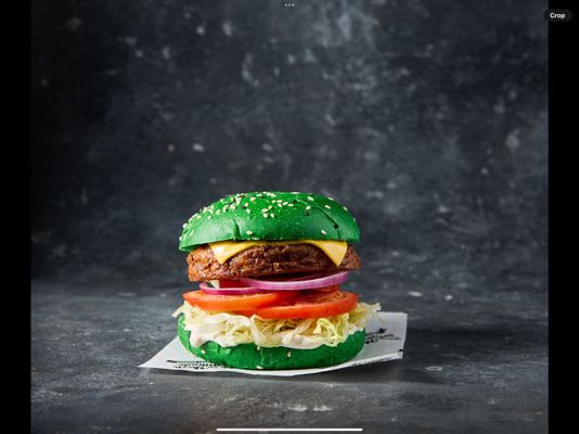 Homemade fried veggie patty, American cheese, fresh lettuce and tomato with red onion and truffle mayo, served on a green spinach bun.