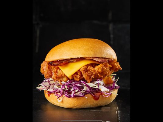 Crispy fried chicken breast, house-made slaw, smoked bacon, Cheddar cheese with smokey bbq sauce in a milk bun