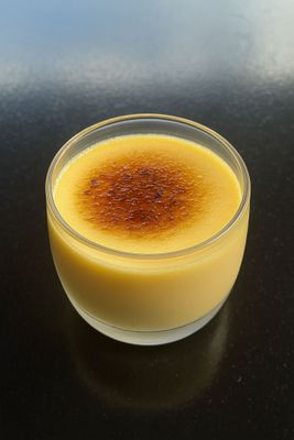 Silky smooth vanilla custard topped with a perfectly caramelised golden sugar crust. Crack through the crisp top layer to reveal the creamy richness beneath — a timeless French classic.