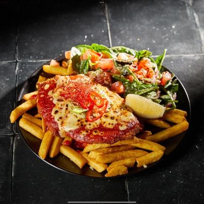 Our signature chicken parmigiana, layered with rich Napoli sauce, melted mozzarella and a hint of Parmesan. Served alongside golden chips and a crisp garden salad.