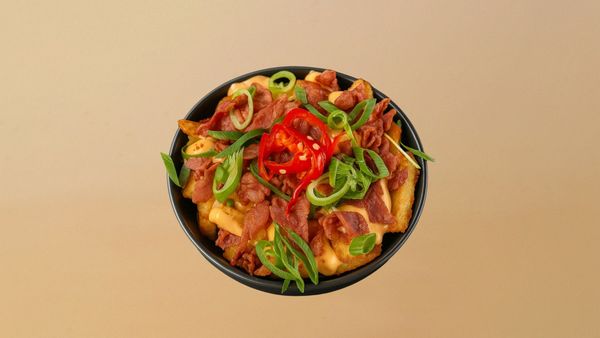 Golden potato fries piled high with crispy smoked bacon, smothered in rich Cheddar cheese sauce and topped with fresh spring onions. A timeless favourite that hits every time.