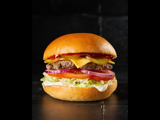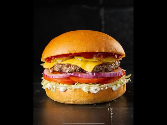 Grass fed beef patty, American cheese, lettuce, tomato, onion, pickles, with ketchup and mayo, in a milk bun.