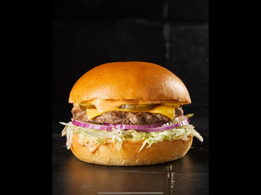 One grass fed beef patty, American cheese, lettuce, onion, pickles, with NYM special sauce, in a milk bun