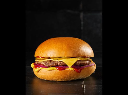 Grass fed beef patty, American cheese, pickles & onion, ketchup and mustard, in a milk bun