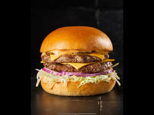 Two grass fed beef patties, American cheese, lettuce, onion, pickles, with NYM special sauce, in a milk bun.