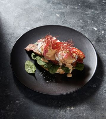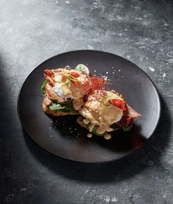 House smoked brisket layered with a homemade hollandaise sauce and perfectly poached egg. All a top a bed of spinach & buttered sourdough. Finished with our signature house garnish.