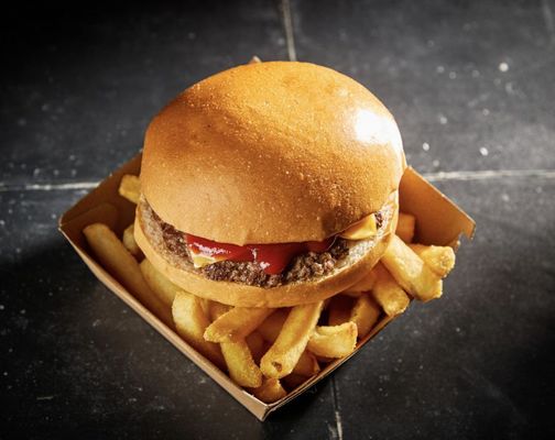 Grass fed beef patty, American cheese and ketchup, in a milk bun