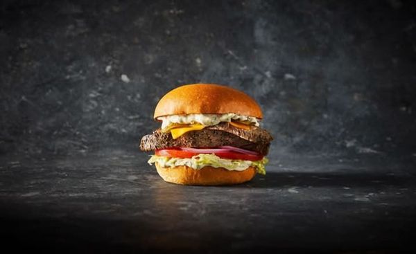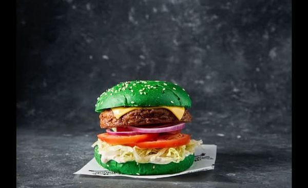 Homemade fried veggie patty, American cheese, fresh lettuce and tomato with red onion and truffle mayo, served on a green spinach bun.