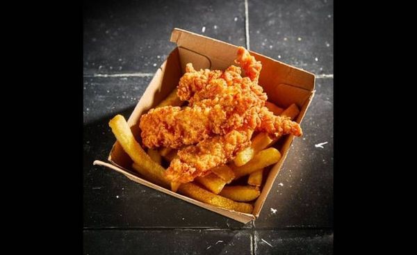 3 chicken strips served with a side of fries. Fries seasoned with chicken salt.