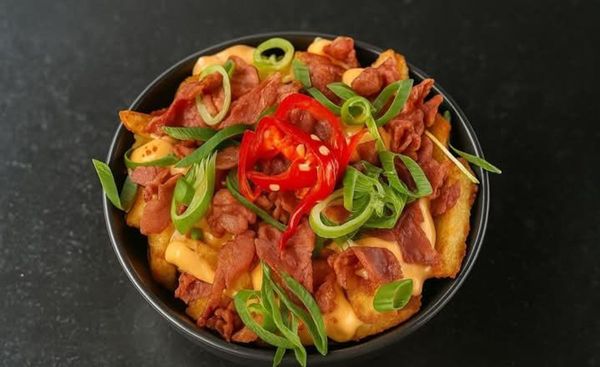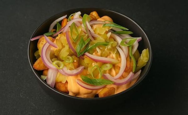 Golden potato fries piled high with crispy smoked bacon, smothered in rich Cheddar cheese sauce and topped with fresh spring onions. A timeless favourite that hits every time.