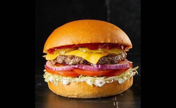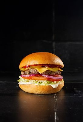 Grass fed beef patty, American cheese, lettuce, tomato, onion, pickles, with ketchup and mayo, in a milk bun.