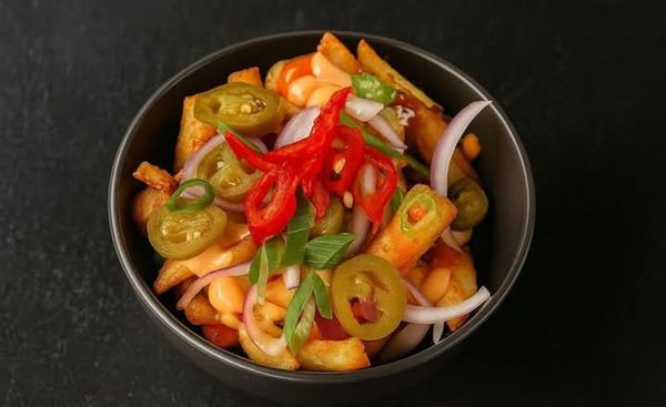 Topped with jalapenos, red onions, spring onions, hot chilli sauce and gooey Cheddar cheese sauce.