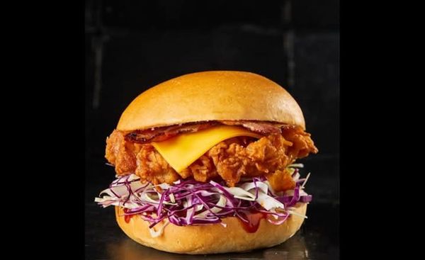 Crispy fried chicken breast, house-made slaw, smoked bacon, Cheddar cheese with smokey bbq sauce in a milk bun