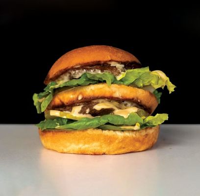 Two grass fed beef patties, American cheese, lettuce, onion, pickles, with NYM special sauce, in a milk bun.