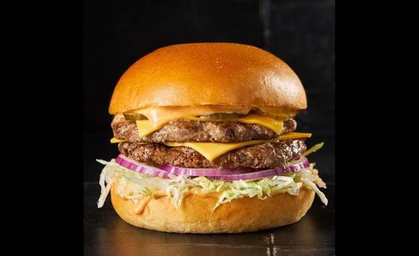 Two grass-fed beef patties with melted Cheddar, crisp lettuce, onion, pickles, and NYM’s signature special sauce, stacked in a soft milk bun with a middle bun for that double-deck bite.