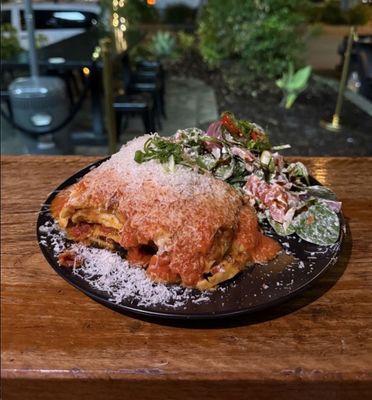 Our signature beef brisket lasagna, layered with rich Napoli sauce, melted mozzarella and a hint of Parmesan. Served alongside golden chips and a crisp garden salad.