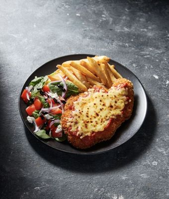 Our signature chicken parmigiana, layered with rich Napoli sauce, melted mozzarella and a hint of Parmesan. Served alongside golden chips and a crisp garden salad.